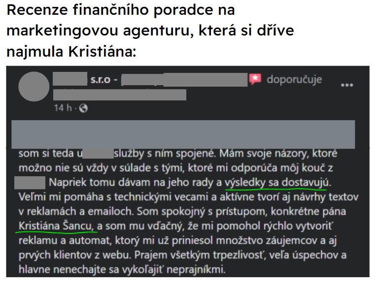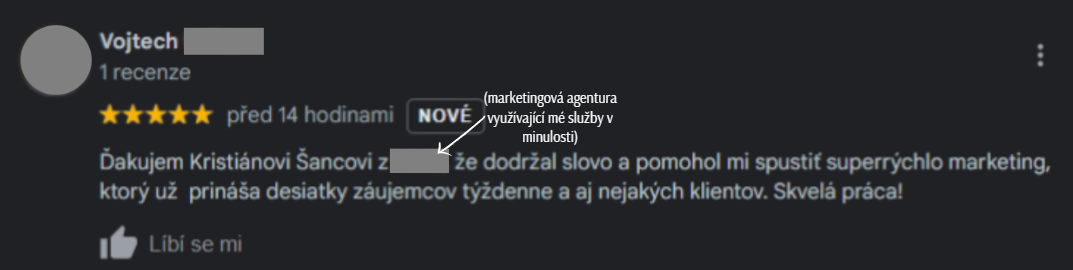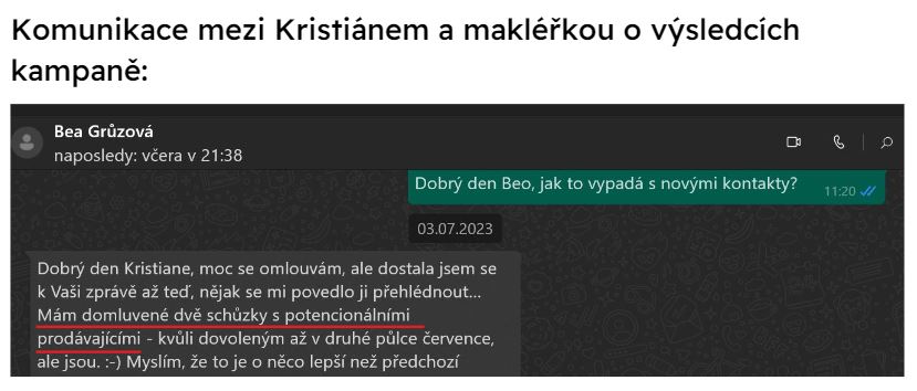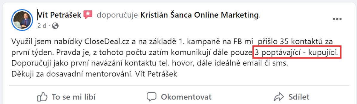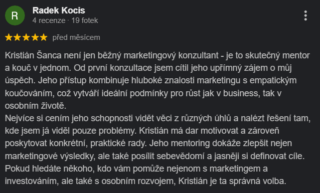Spolupráce s Kristiánem Šancou výrazně předčila má očekávání. Za 11 dnů spolupráce jsem získal přes 160 kontaktů na kupující. První schůzky již proběhly, další jsou naplánované v průběhu prázdnin. Výborné je, že jednotlivé kampaně se průběžně vylaďují a Kristián je ochotný poskytovat i různé tipy na další marketingové aktivity, které přinášejí výsledky. Za mě je dosavadní spolupráce super a určitě v ní budu pokračovat.
