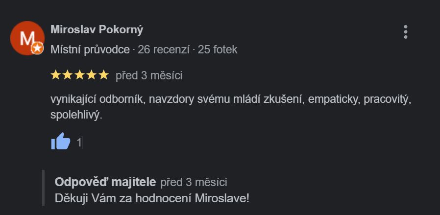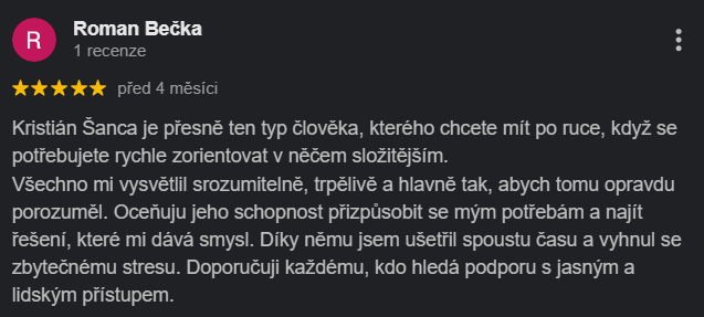 Vřele doporučuji pana Šancu na základě vlastní zkušenosti, která pro mne byla přínosem. Rychlé a spolehlivé jednání, hlavně korektní. Děkuji a doporučuji.