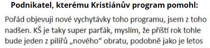 Jak Kristián pomohl Jiřímu s jeho s podnikáním uvidíte ve videu. Téměř z nuly jsme se dostali během týdne na tržby 1,5 milionu Kč. ↓