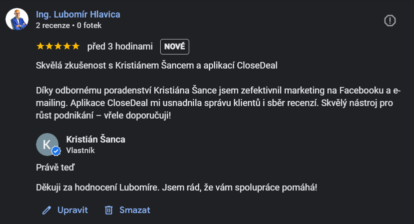 Na pana Šancu jsem se obrátila s tím, že potřebuji pomoct s marketingem na sítích a na získávání kontaktů na klienty. Moc jsem od toho neočekávala, ale výsledek je super. Naše spolupráce trvá 14 dnů, spustili jsme 2 kampaně a mám 74 kontaktů. Navíc mi vše trpělivě vysvětluje a má pochopení pro moji neznalost technologií. Konečně mám pocit, že mají sociální sítě smysl. Všem doporučuji spolupráci s panem Šancou.