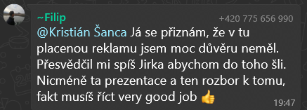Spolupráci s Kristiánem si chválím. Snaží se rychle reagovat na podněty, rychlé spuštění kampaní, při tvorbě návrhů reaguje na aktuální dění na trhu. Snaha vyjít vstříc. Spolupráci určitě mohu doporučit.